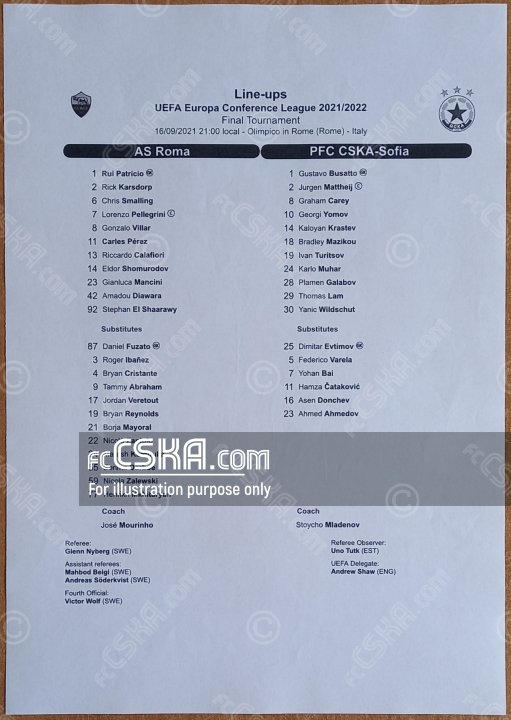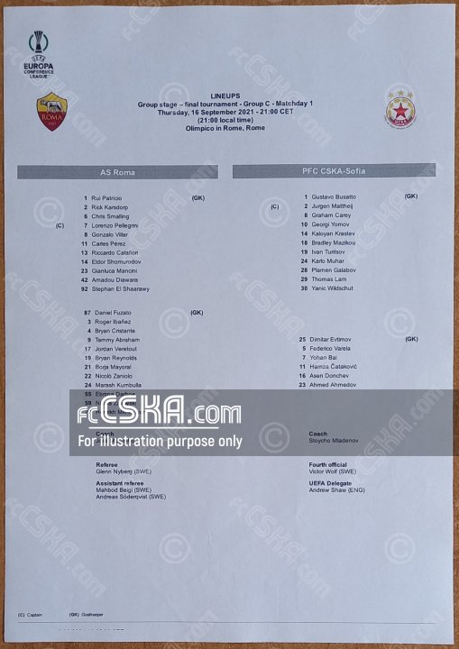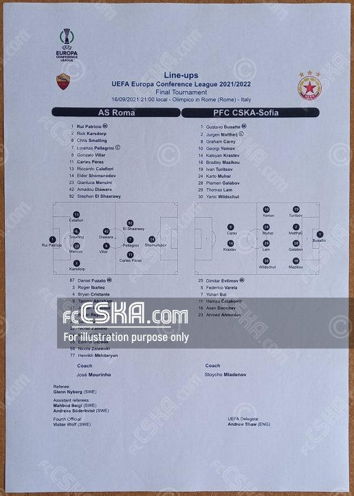 ЦСКА проиграла Рома (Рим) со счётом 5:1 в матче Лига конференций 2021/22 - группа «C» сыгранный 16 Сентябрь 2021 г. в 22:00 ч. за армейцев отличился Грэм Кэри (10′).