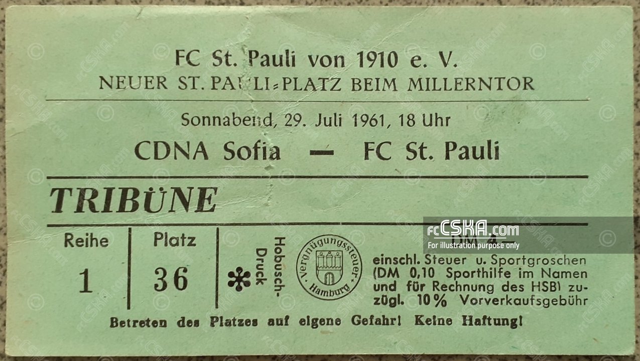 ЦДНА выиграл у Санкт-Паули (Гамбург) со счётом 4:7 в матче Товарищеские матчи 1961/62 сыгранный 29 Июль 1961 г. в 19:00 ч. за армейцев отличились Иван Колев, Никола Цанев, Ivan Rankov и Димитр Якимов.
