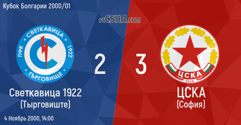 ЦСКА выиграл у Светкавица 1922 (Тырговиште) со счётом 2:3 в матче Кубок Болгарии 2000/01 сыгранный 4 Ноябрь 2000 г. в 14:00 ч. за армейцев отличились Христо Янев (78′), Константин Мирчев (81′) и Асен Букарев (107′).