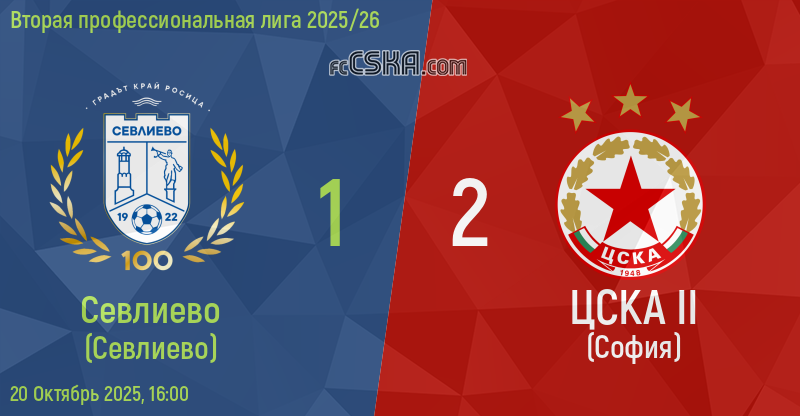 ЦСКА II выиграл у Севлиево (Севлиево) со счётом 1:2 в матче Вторая профессиональная лига 2025/26 сыгранный 20 Октябрь 2025 г. в 16:00 ч.