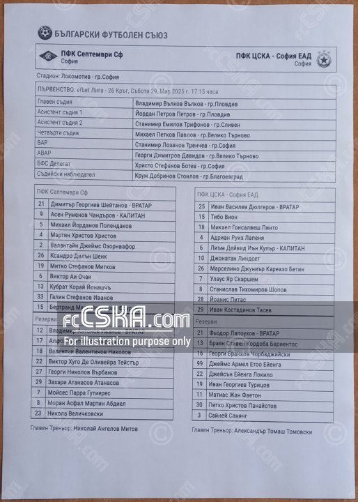 ЦСКА выиграл у Септември (София) со счётом 0:1 в матче Первая профессиональная лига 2024/25 сыгранный 29 Март 2025 г. в 17:15 ч. на стадионе „Локомотив“ в София. за армейцев отличился Джеймс Это'о (96′).