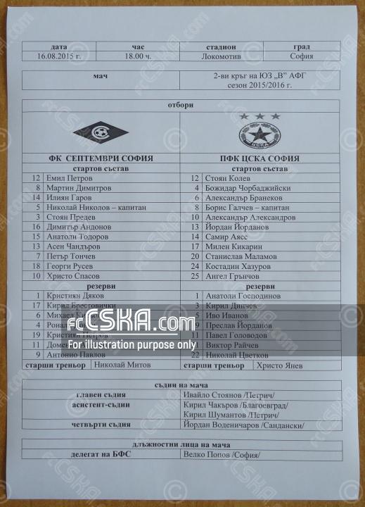 ЦСКА выиграл у Септември (София) со счётом 0:3 в матче Юго-Западная «В» группа 2015/16 сыгранный 16 Август 2015 г. в 18:00 ч. на стадионе „Локомотив“ в София. за армейцев отличились Костадин Хазуров (15′ и 42′ from penalty) и Boris Galchev (77′).