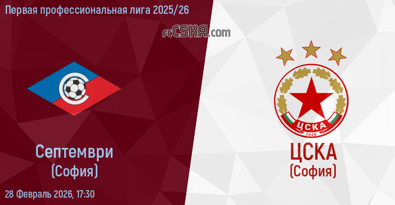 Септември Сф будет играть с ЦСКА в матче Первая профессиональная лига 2025/26 28 Февраль 2026 г. в 17:30 ч.
