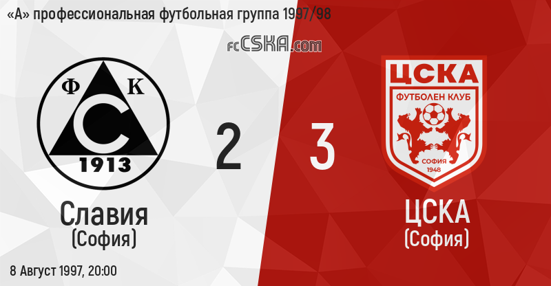ЦСКА​ выиграл у Славия (София) со счётом 2:3 в матче «А» профессиональная футбольная группа 1997/98 сыгранный 8 Август 1997 г. в 20:00 ч. на стадионе „Васил Левски“ в София. за армейцев отличились Адальберт Зафиров (23′), Bozhidar Dzhurkovich (31′) и Ivaylo Andonov (75′).