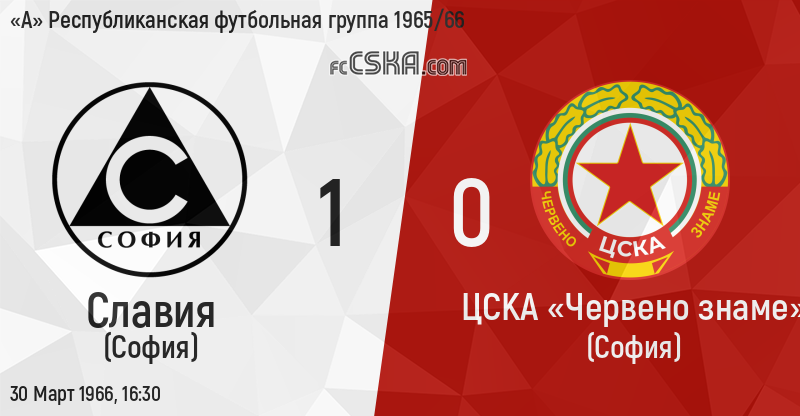 ЦСКА «Червено знаме» проиграла Славия (София) со счётом 1:0 в матче «А» Республиканская футбольная группа 1965/66 сыгранный 30 Март 1966 г. в 16:30 ч. на стадионе „Васил Левски“ в София.