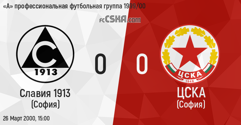 ЦСКА сыграла вничью с фк Славия 1913 (София) со счётом 0:0 в матче «А» профессиональная футбольная группа 1999/00 сыгранный 26 Март 2000 г. в 15:00 ч. на стадионе „Славия“ в София.