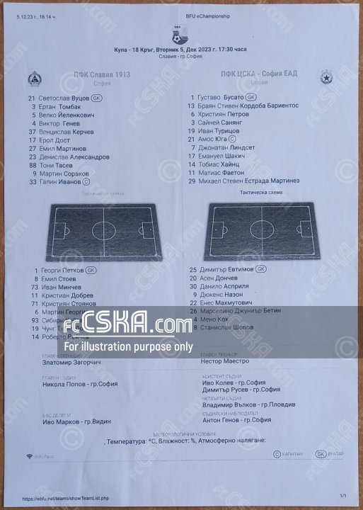 ЦСКА выиграл у Славия 1913 (София) со счётом 0:1 в матче Кубок Болгарии 2023/24 сыгранный 5 Декабрь 2023 г. в 17:30 ч. на стадионе „Александър Шаламанов“ в София. за армейцев отличился Маттиас Фаэтон (27′).