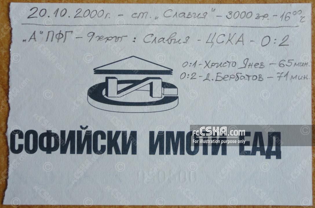 ЦСКА выиграл у Славия 1913 (София) со счётом 0:2 в матче Высшая профессиональная лига 2000/01 сыгранный 20 Октябрь 2000 г. в 16:00 ч. на стадионе „Славия“ в София. за армейцев отличились Христо Янев (65′) и Димитр Бербатов (70′).