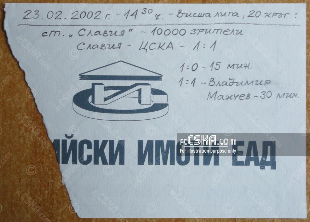 ЦСКА сыграла вничью с фк Славия 1913 (София) со счётом 1:1 в матче Высшая профессиональная лига 2001/02 сыгранный 23 Февраль 2002 г. в 14:30 ч. на стадионе „Славия“ в София. за армейцев отличился Владимир Манчев (30′).