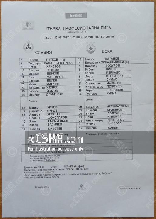 ЦСКА сыграла вничью с фк Славия 1913 (София) со счётом 1:1 в матче Первая профессиональная лига 2017/18 сыгранный 15 Июль 2017 г. в 21:00 ч. на стадионе „Васил Левски“ в София. за армейцев отличился Fernando Karanga (28′).