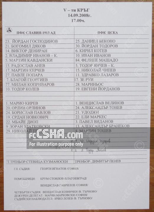 ЦСКА выиграл у Славия 1913 (София) со счётом 1:2 в матче «А» футбольная группа 2008/09 сыгранный 14 Сентябрь 2008 г. в 17:00 ч. на стадионе „Славия“ в София. за армейцев отличились Yordan Todorov (14′) и Тодор Янчев (55′).