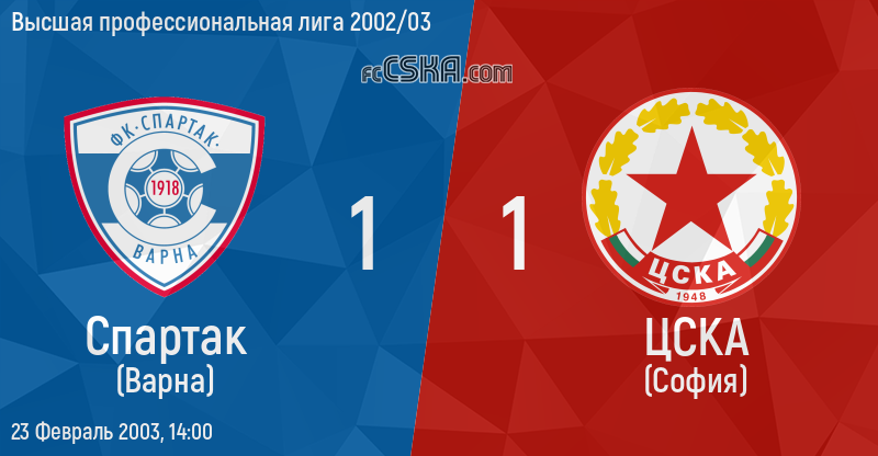 ЦСКА сыграла вничью с фк Спартак (Варна) со счётом 1:1 в матче Высшая профессиональная лига 2002/03 сыгранный 23 Февраль 2003 г. в 14:00 ч. за армейцев отличился Emil Gargorov (18′).
