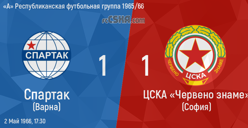 ЦСКА​ «Червено знаме» сыграла вничью с фк Спартак (Варна) со счётом 1:1 в матче «А» Республиканская футбольная группа 1965/66 сыгранный 2 Май 1966 г. в 17:30 ч. за армейцев отличился Димитр Пенев (2′).