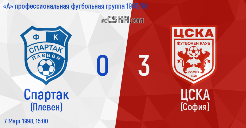 ЦСКА​ выиграл у Спартак (Плевен) со счётом 0:3 в матче «А» профессиональная футбольная группа 1997/98 сыгранный 7 Март 1998 г. в 15:00 ч. на стадионе „Плевен“ в Плевен. за армейцев отличились Emil Kostadinov (11′ from penalty) и Bozhidar Dzhurkovich (73′ и 84′).