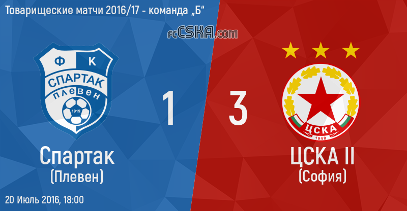 ЦСКА II выиграл у Спартак (Плевен) со счётом 1:3 в матче Товарищеские матчи 2016/17 - команда „Б“ сыгранный 20 Июль 2016 г. в 18:00 ч. на стадионе „Градски“ в Ловеч.