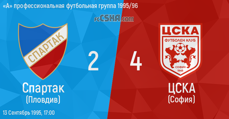 ЦСКА​ выиграл у Спартак (Пловдив) со счётом 2:4 в матче «А» профессиональная футбольная группа 1995/96 сыгранный 13 Сентябрь 1995 г. в 17:00 ч. за армейцев отличились Georgi Donkov (6′), Milen Petkov (35′), Петр Жабов (65′) и Анатоли Нанков (83′).