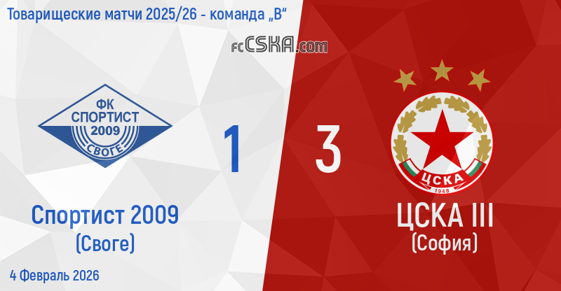 ЦСКА III выиграл у Спортист 2009 (Своге) со счётом 1:3 в матче Товарищеские матчи 2025/26 - команда „В“ сыгранный 4 Февраль 2026 г.