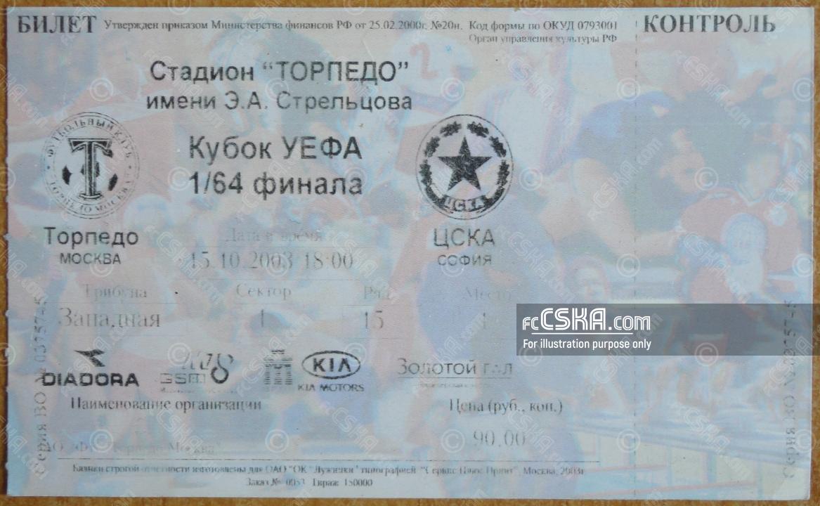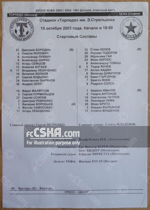 ЦСКА сыграла вничью с фк Торпедо (Москва) со счётом 1:1 в матче Кубок УЕФА 2003/04 сыгранный 15 Октябрь 2003 г. в 17:00 ч. за армейцев отличились Velizar Dimitrov (92′), Леонардо Лео Лима (127′ from penalty) и Stoyan Kolev (127′ from penalty).