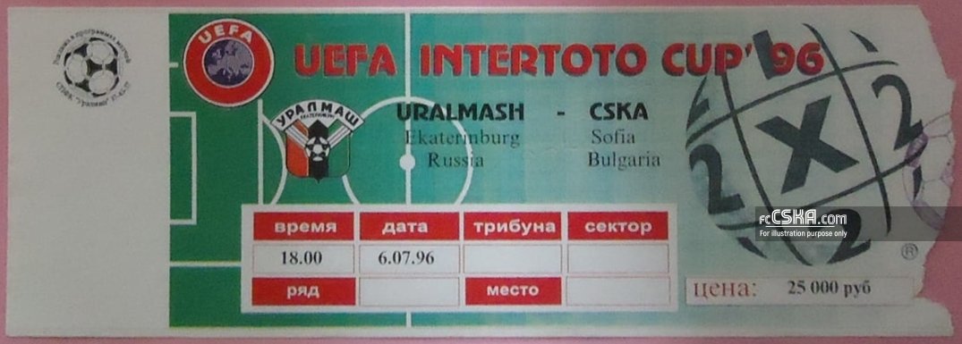 ЦСКА проиграла Уралмаш (Екатеринбург) со счётом 2:1 в матче Кубок Интертото 1996 сыгранный 6 Июль 1996 г. в 15:00 ч. за армейцев отличился Иво Славчев (20′).