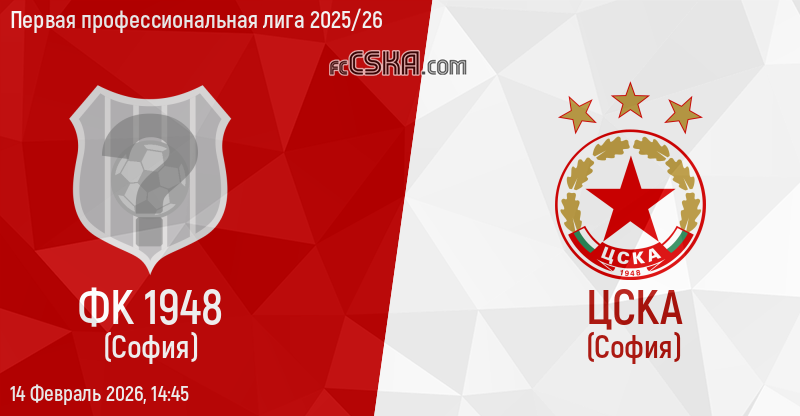 ЦСКА будет играть с ФК 1948 в матче Первая профессиональная лига 2025/26 14 Февраль 2026 г. в 14:45 ч. матч будет транслироваться в прямом эфире „Diema sport”.