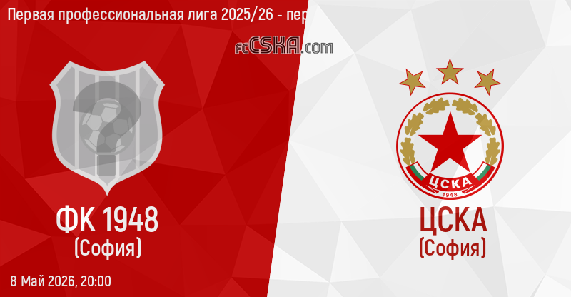 ЦСКА будет играть с ФК 1948 в матче Первая профессиональная лига 2025/26 - первая группа 8 Май 2026 г. в 20:00 ч. матч будет транслироваться в прямом эфире „Diema sport”.