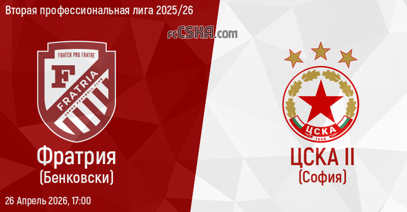 ЦСКА II будет играть с Фратрия в матче Вторая профессиональная лига 2025/26 26 Апрель 2026 г. в 17:00 ч.