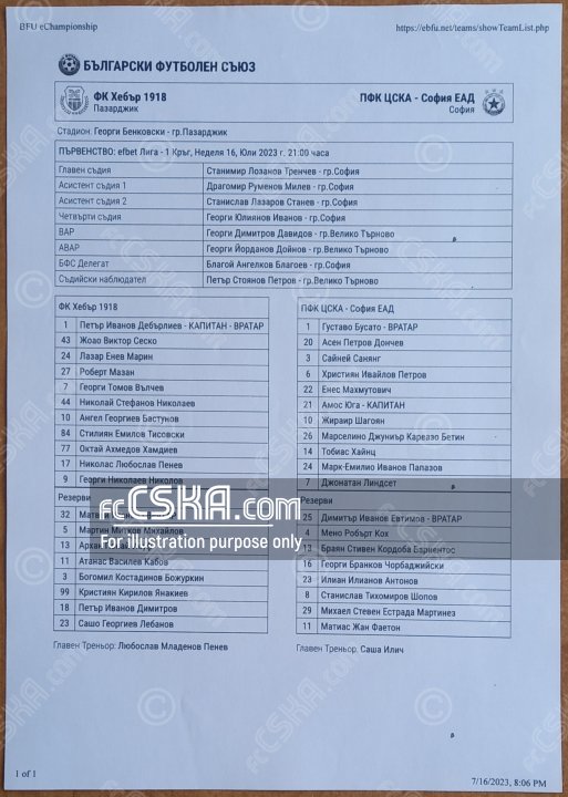 ЦСКА сыграла вничью с фк Хебар 1918 (Пазарджик) со счётом 0:0 в матче Первая профессиональная лига 2023/24 сыгранный 16 Июль 2023 г. в 21:00 ч. на стадионе „Георги Бенковски“ в Пазарджик.