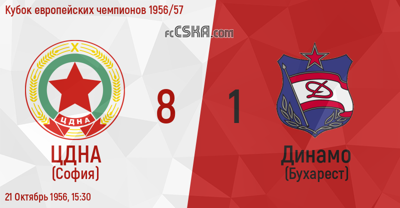 ЦДНА выиграл у Динамо (Бухарест) со счётом 8:1 в матче Кубок европейских чемпионов 1956/57 сыгранный 21 Октябрь 1956 г. в 15:30 ч. на стадионе „Васил Левски“ в София. за армейцев отличились Иван Колев (12′, 56′ и 63′), Димитр Миланов (20′ и 64′), Панайот Панайотов (27′ и 66′) и Георги Димитров — Червения (80′).