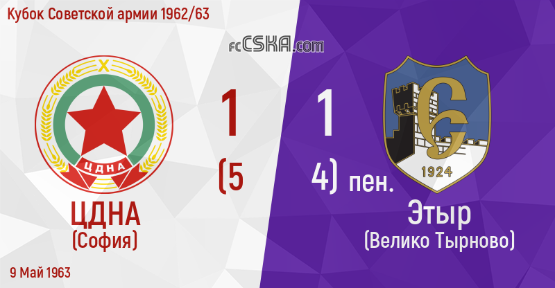 ЦДНА сыграла вничью с фк Этыр (Велико Тырново) со счётом 1:1 в матче Кубок Советской армии 1962/63 сыгранный 9 Май 1963 г. на стадионе „Народна армия“ в София. за армейцев отличились Иван Колев (40′), Stoyan Koshev (96′ from penalty), Никола Ковачев (97′ from penalty), Ivan Rankov (98′ from penalty) и Никола Цанев (99′ from penalty).