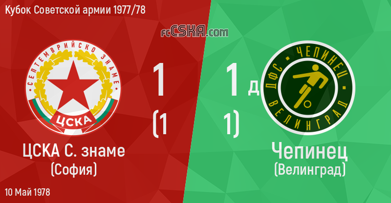 ЦСКА «Септемврийско знаме» сыграла вничью с фк Чепинец (Велинград) со счётом 1:1 в матче Кубок Советской армии 1977/78 сыгранный 10 Май 1978 г. на стадионе „Васил Левски“ в София. за армейцев отличились Божил Колев (115′ from penalty и 122′ from penalty), Nikola Hristov (122′ from penalty), Цветан Йончев (122′ from penalty) и Georgi Denev (122′ from penalty).