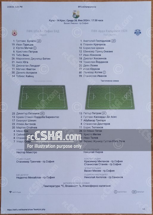 ЦСКА выиграл у Арда 1924 (Кырджали) со счётом 1:0 в матче Кубок Болгарии 2023/24 сыгранный 28 Февраль 2024 г. в 17:30 ч. на стадионе „Васил Левски“ в София. за армейцев отличился Амос Юга (18′).