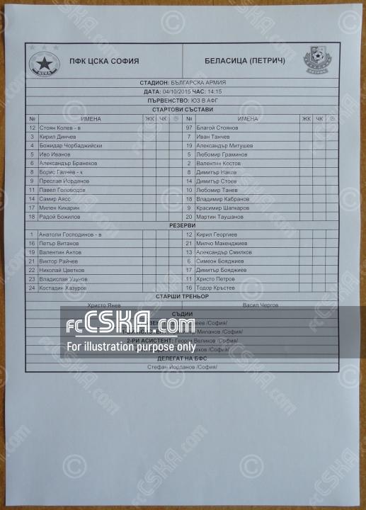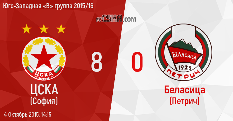 ЦСКА выиграл у Беласица (Петрич) со счётом 8:0 в матче Юго-Западная «В» группа 2015/16 сыгранный 4 Октябрь 2015 г. в 14:15 ч. на стадионе „Болгарска армия“ в София. за армейцев отличились Boris Galchev (7′ и 89′), Preslav Yordanov (44′, 49′ и 60′) и Nikolay Tsvetkov (55′ и 71′). Автогол - guests scored Иван Танчев[1] (51′).