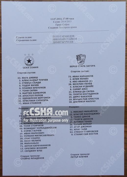 ЦСКА сыграла вничью с фк Берое (Стара Загора) со счётом 0:0 в матче Товарищеские матчи 2014/15 сыгранный 12 Июль 2014 г. в 17:00 ч. на стадионе „Болгарска армия“ в София.