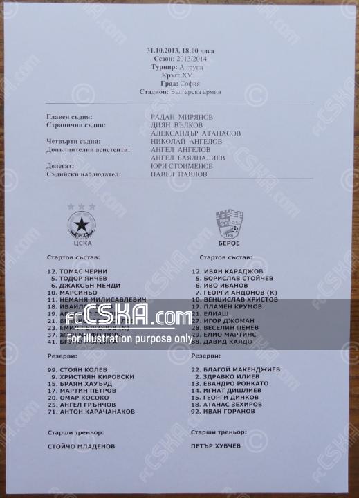 ЦСКА выиграл у Берое (Стара Загора) со счётом 1:0 в матче «А» футбольная группа 2013/14 сыгранный 31 Октябрь 2013 г. в 18:00 ч. на стадионе „Болгарска армия“ в София. за армейцев отличился Bruno Moreyra (28′).