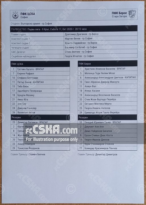ЦСКА сыграла вничью с фк Берое (Стара Загора) со счётом 1:1 в матче Первая профессиональная лига 2020/21 сыгранный 17 Октябрь 2020 г. в 20:15 ч. на стадионе „Болгарска армия“ в София. за армейцев отличился Валентин Антов (54′).