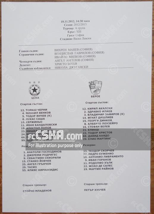 ЦСКА выиграл у Берое (Стара Загора) со счётом 2:0 в матче «А» футбольная группа 2012/13 сыгранный 18 Ноябрь 2012 г. в 14:30 ч. на стадионе „Васил Левски“ в София. за армейцев отличился Mishel Platini (30′ и 58′ from penalty).