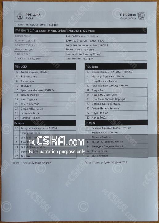 ЦСКА выиграл у Берое (Стара Загора) со счётом 2:0 в матче Первая профессиональная лига 2019/20 сыгранный 7 Март 2020 г. в 17:30 ч. на стадионе „Болгарска армия“ в София. за армейцев отличился Грэм Кэри (59′ и 72′).