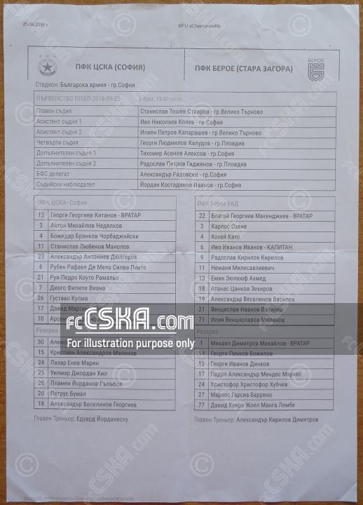 ЦСКА​ выиграл у Берое (Стара Загора) со счётом 4:0 в матче Первая профессиональная лига 2016/17 сыгранный 25 Сентябрь 2016 г. в 19:00 ч. на стадионе „Болгарска армия“ в София. за армейцев отличились David Simao (5′ from penalty), Густаво Кулма (9′), Diogo Viana (50′) и Rui Pedro (81′).