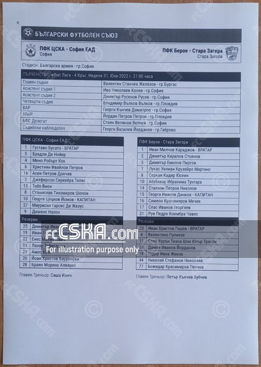 ЦСКА выиграл у Берое (Стара Загора) со счётом 5:1 в матче Первая профессиональная лига 2022/23 сыгранный 31 Июль 2022 г. в 21:00 ч. на стадионе „Болгарска армия“ в София. за армейцев отличились Маурисио Гарсес Жезус (5′ и 96′), Дюкенс Назон (18′), Браян Морено (75′) и Иван Турицов (94′ from penalty).