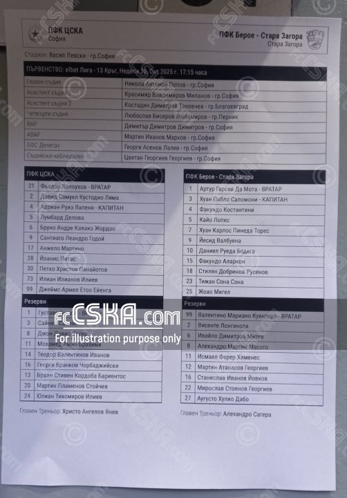 ЦСКА​ выиграл у Берое (Стара Загора) со счётом 5:1 в матче Первая профессиональная лига 2025/26 сыгранный 26 Октябрь 2025 г. в 17:15 ч. на стадионе „Васил Левски“ в София. за армейцев отличились Петко Панайотов (39′), Иоаннис Питтас (45′ и 51′), Илиан Илиев (48′) и Леандро Годой (59′).