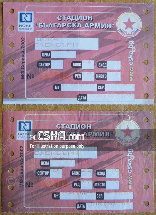 ЦСКА сыграла вничью с фк Блэкберн Роверс со счётом 3:3 в матче Кубок УЕФА 2002/03 сыгранный 3 Октябрь 2002 г. в 19:30 ч. на стадионе „Болгарска армия“ в София. за армейцев отличились Emil Gargorov (65′ и 89′ from penalty) и Агналдо Перейра (71′).