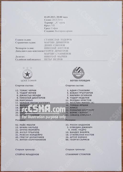 ЦСКА сыграла вничью с фк Ботев (Пловдив) со счётом 0:0 в матче «А» футбольная группа 2013/14 сыгранный 1 Сентябрь 2013 г. в 20:00 ч. на стадионе „Болгарска армия“ в София.