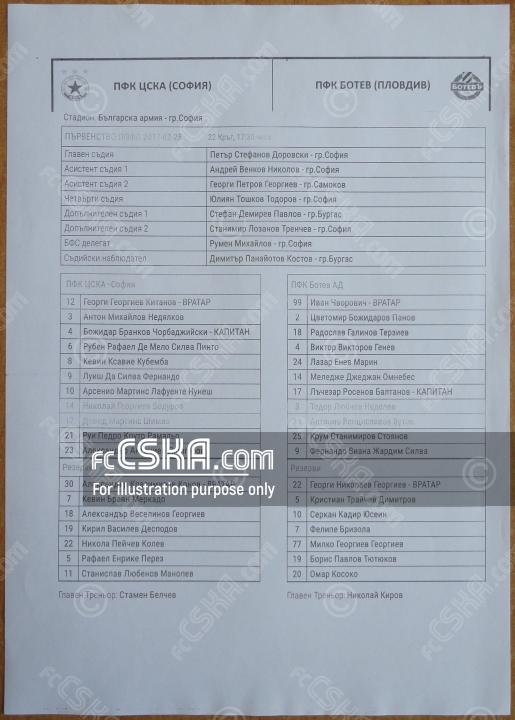 ЦСКА​ сыграла вничью с фк Ботев (Пловдив) со счётом 0:0 в матче Первая профессиональная лига 2016/17 сыгранный 28 Февраль 2017 г. в 17:30 ч. на стадионе „Болгарска армия“ в София.