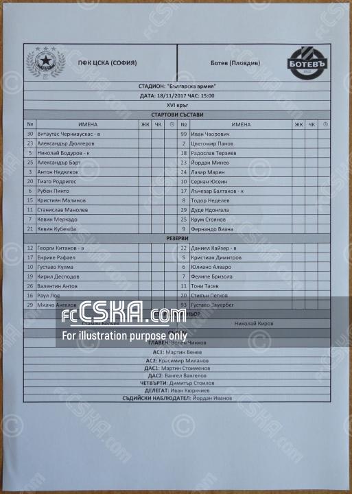 ЦСКА​ сыграла вничью с фк Ботев (Пловдив) со счётом 1:1 в матче Первая профессиональная лига 2017/18 сыгранный 18 Ноябрь 2017 г. в 15:00 ч. на стадионе „Болгарска армия“ в София. Автогол - guests scored Lazar Marin (78′).