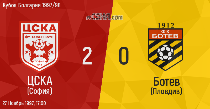 ЦСКА выиграл у Ботев (Пловдив) со счётом 2:0 в матче Кубок Болгарии 1997/98 сыгранный 27 Ноябрь 1997 г. в 17:00 ч. на стадионе „Болгарска армия“ в София. за армейцев отличились Эмил Кременлиев (24′) и Петр Жабов (72′).