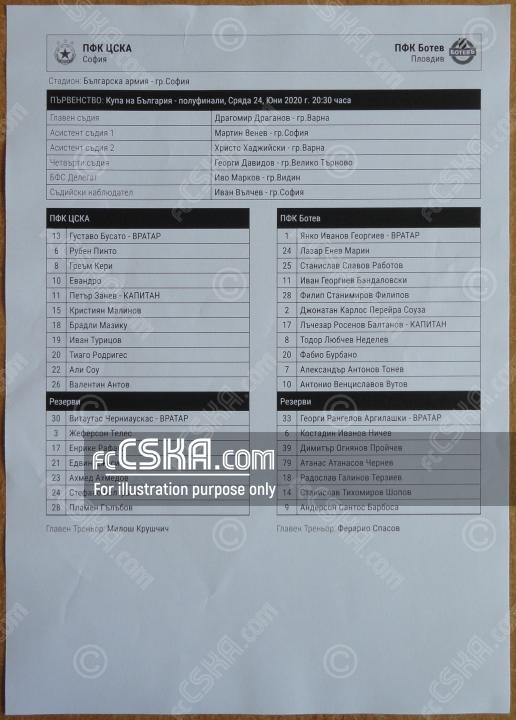 ЦСКА​ выиграл у Ботев (Пловдив) со счётом 2:0 в матче Кубок Болгарии 2019/20 сыгранный 24 Июнь 2020 г. в 20:30 ч. на стадионе „Болгарска армия“ в София. за армейцев отличился Али Соу (54′). Автогол - guests scored Ivan Bandalovski (19′).