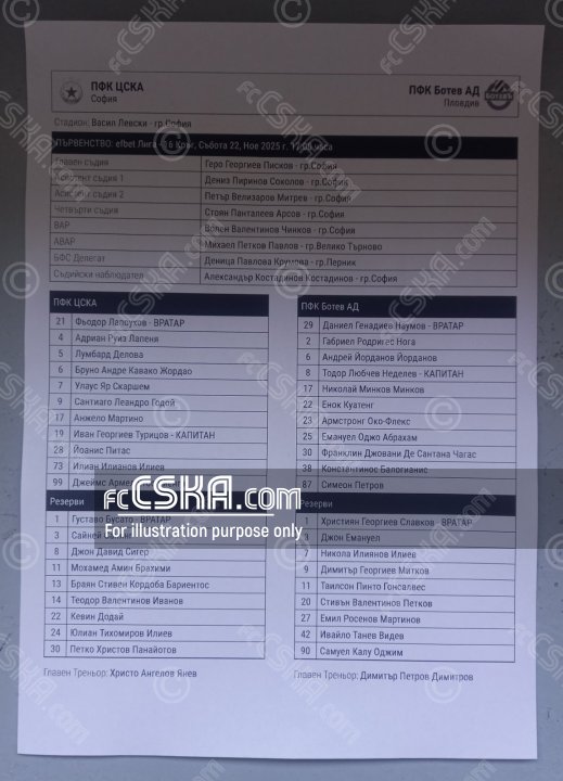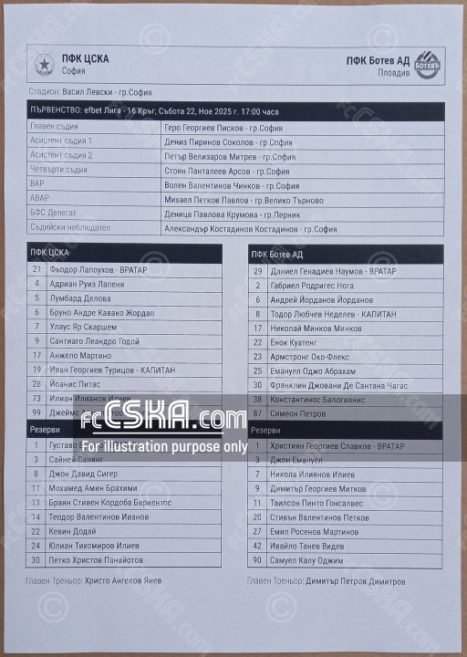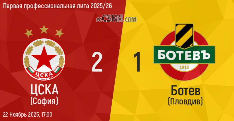 ЦСКА выиграл у Ботев (Пловдив) со счётом 2:1 в матче Первая профессиональная лига 2025/26 сыгранный 22 Ноябрь 2025 г. в 17:00 ч. на стадионе „Васил Левски“ в София. за армейцев отличился Леандро Годой (72′ и 93′).