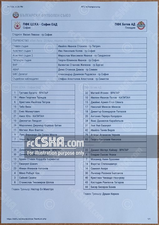 ЦСКА​ выиграл у Ботев (Пловдив) со счётом 4:0 в матче Первая профессиональная лига 2023/24 сыгранный 17 Март 2024 г. в 17:45 ч. на стадионе „Васил Левски“ в София. за армейцев отличились Джонатан Линдсет (25′), Fernando Karanga (33′ и 42′) и Маттиас Фаэтон (65′).