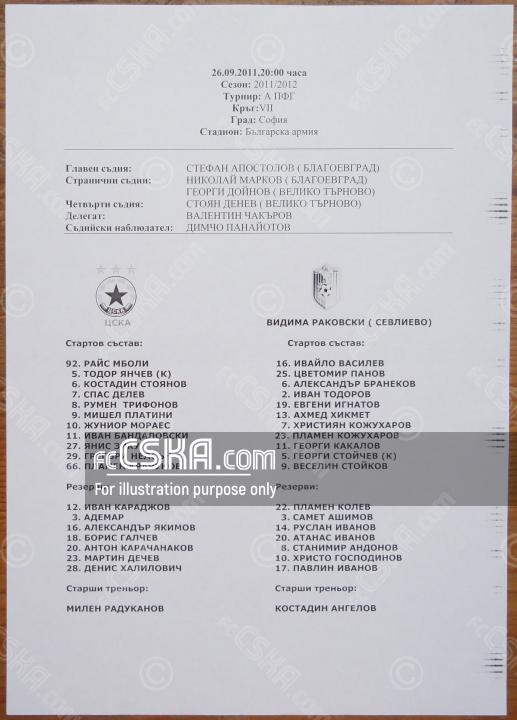 ЦСКА выиграл у Видима-Раковски (Севлиево) со счётом 4:1 в матче «А» футбольная группа 2011/12 сыгранный 26 Сентябрь 2011 г. в 20:00 ч. на стадионе „Болгарска армия“ в София. за армейцев отличились Plamen Krachunov (23′), Spas Delev (35′) и Янис Зику (72′ и 87′ from penalty).