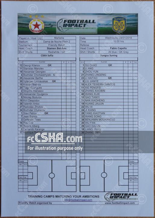 ЦСКА выиграл у Дзянсу Сунин (Нанкин) со счётом 8:0 в матче Товарищеские матчи 2017/18 сыгранный 24 Январь 2018 г. в 17:00 ч. за армейцев отличились Кирил Десподов (17′, 65′ from penalty и 68′), Fernando Karanga (35′), Roland Alberg (42′), Радослав Живков (85′), Стойчо Атанасов (88′) и Stanislav Manolev (89′ from penalty).